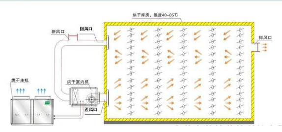 在壓縮機內完成氣態的升壓升溫過程(溫度高達100度),它進入內機釋放出高溫熱量加熱烘干房內空氣,同時自己被冷卻并轉化為流液態,當它運行到外機后,液態迅速吸熱蒸發再次轉化為氣態,同時溫度可下降至-0℃至-10℃,這時吸熱器周邊的空氣就會源源不斷地將熱量傳遞給冷媒。